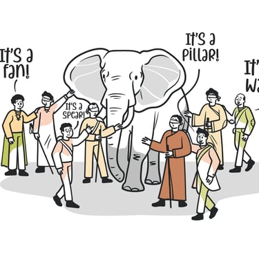 The man who touched the side yelled out that the elephant felt like a wall. The one who grasped the tusk thought the elephant resembled a spear. The man who touched the leg thought the elephant resembled a pillar. The man who felt the ear said the elephant is shaped like a fan. They started arguing, each believing their description of the elephant was correct.